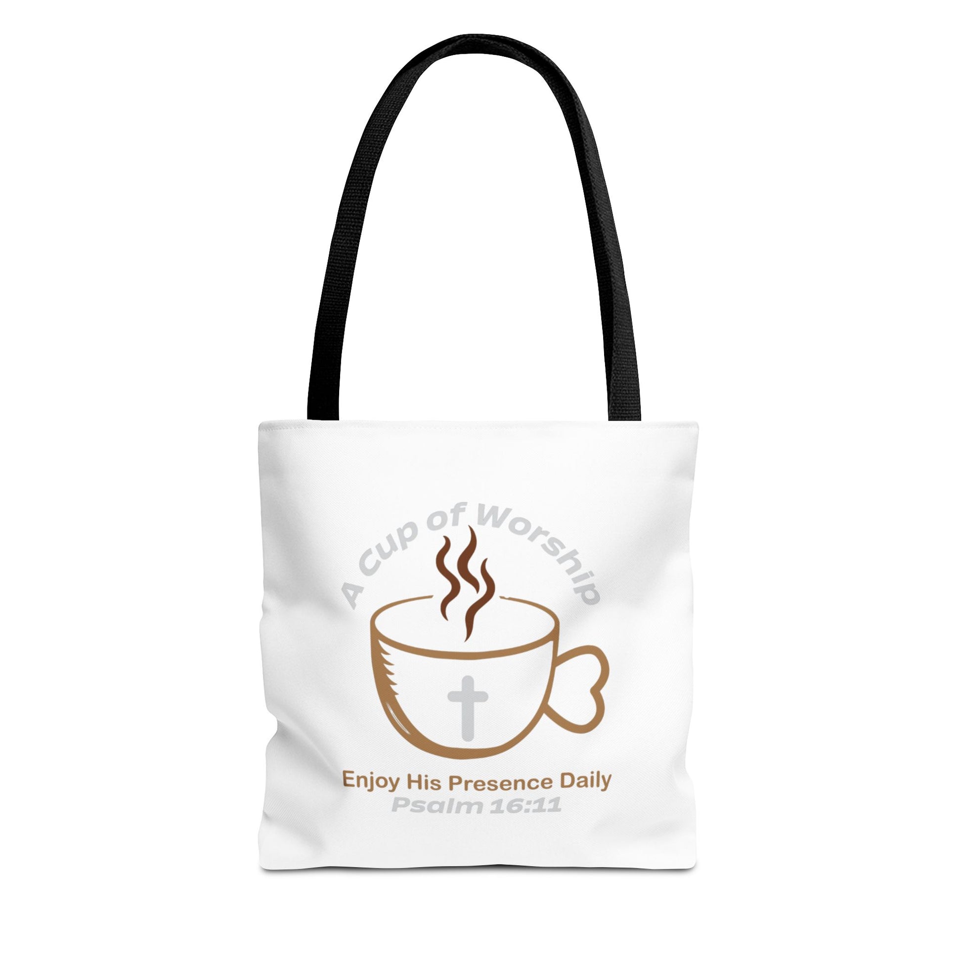 Embrace your daily adventures with this stylish tote bag, designed for those who appreciate both functionality and flair. The cheerful design featuring a warm cup of worship infuses your day with positivity and inspiration. Perfect for carrying essentials to the grocery store, gym, or beach, this tote bag is an ideal companion for any activity. It fits seamlessly into the lives of busy individuals, mothers on the go, or anyone looking to add a touch of joy to their everyday errands.